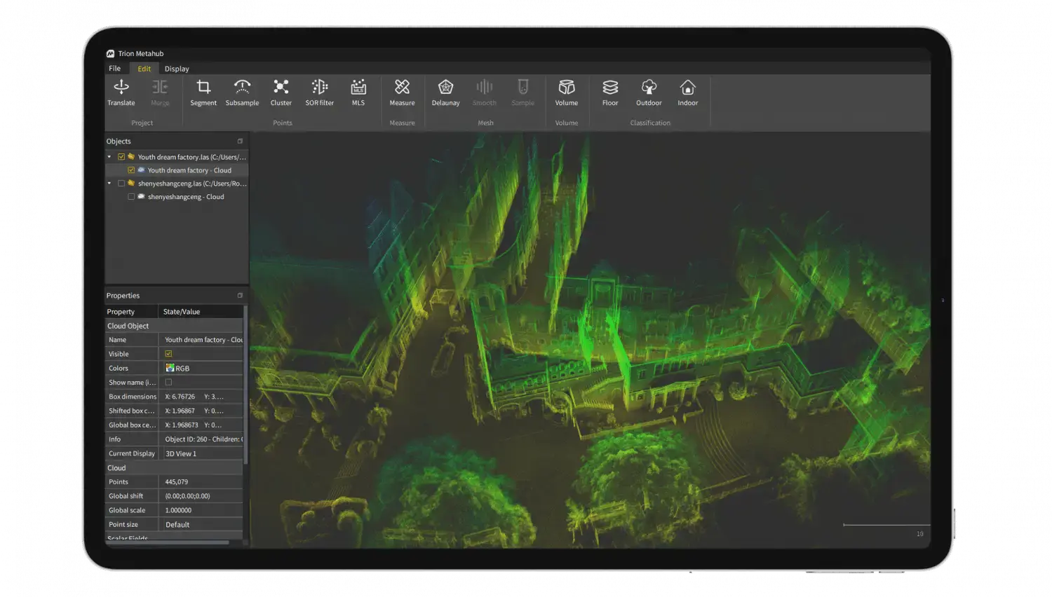 Point cloud processing softwareFJD Trion Model is a PC-based point cloud processing solution that enables denoising, colorization, and classification. Industry-specific modules empower quick and seamless results for like floor plan generation for construction, volume calculation for tunnels, and tree segmentation for forestry.